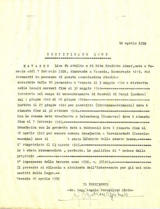 Shortly thereafter they moved to Prague (to a reception institute for former prisoners called the “House of Italy”) and finally to a collection camp in Wiener Neustadt, near Vienna. They returned to Italy on August 20, 1945, after passing through Hungary and again to Austria.