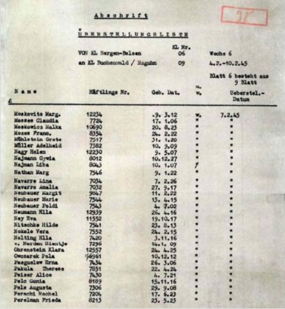 On 31 October 1944, Amalia and Lina were transferred to Berghen-Belsen and then to Raghun (Buchenwald subcamp) on 7 February 1945. In mid-April they were moved to Theresienstadt, which had been liberated and was under the administration of the Red Cross.