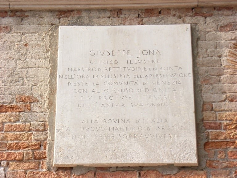 On January 31, 2020, a stumbling stone dedicated to Giuseppe Jona was laid. Two commemorative tombstones are dedicated to him, one in new Ghetto and another at the entrance of the pavilion dedicated to him at the Civil Hospital of Venice.