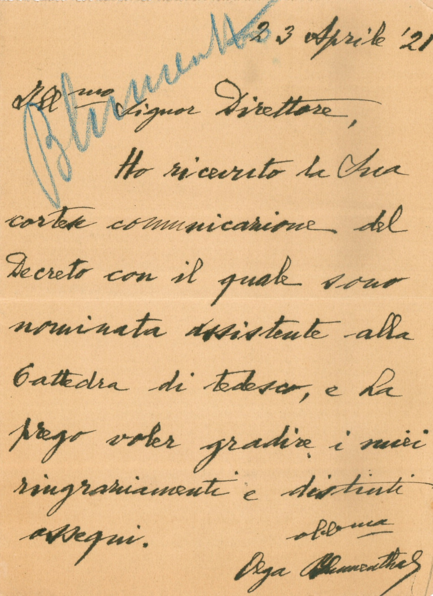 Olga was a German language assistant until 1934 and after that date she became a German reader until 1937, when she was no longer eligible to continue teaching: she was by now over sixty years of age and ten years had passed without her having a permanent position. She was suspended from work, but under pressure from some colleagues she still managed to be hired as a “volunteer assistant”.