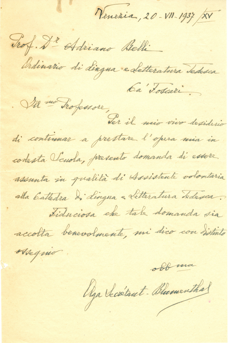 In August 1938, a survey was carried out in all educational institutions in order to identify staff of “Jewish race”. On her card, Olga declared that both parents were Jewish, but her spouse was not. Although the order was to send all completed questionnaires back to Rome, that of Olga Blumenthal remains in Ca’ Foscari. Olga’s name was not even mentioned on the list of Jewish professors present at Ca’ Foscari. Her failure to report is perhaps an extreme form of protection for the elderly teacher by colleagues who only the previous year had worked to ensure that she could continue teaching.