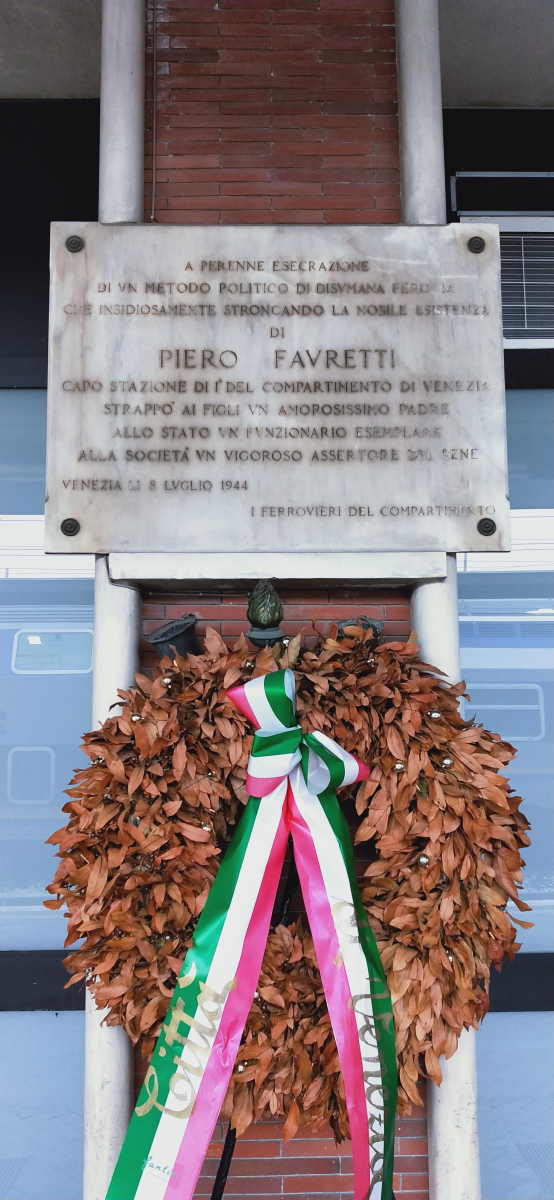 Binario 14 Lapide in memoria di Piero Favretti, capostazione e partigiano cattolico, ucciso nella notte tra il 7 e l’8 luglio 1944, durante una rappresaglia in risposta all’uccisione di tre militi antifascisti effettuata da un gruppo di militi della Guardia Nazionale Repubblicana. Durante la rappresaglia vengono uccise cinque persone e una è ferita gravemente. Delle vittime, cinque sono antifascisti e solo Pietro Favretti è impegnato organicamente nella lotta resistenziale. A lui è anche dedicata una lapide davanti alla sua abitazione, intitolata una calle e il piazzale della stazione di Mestre.