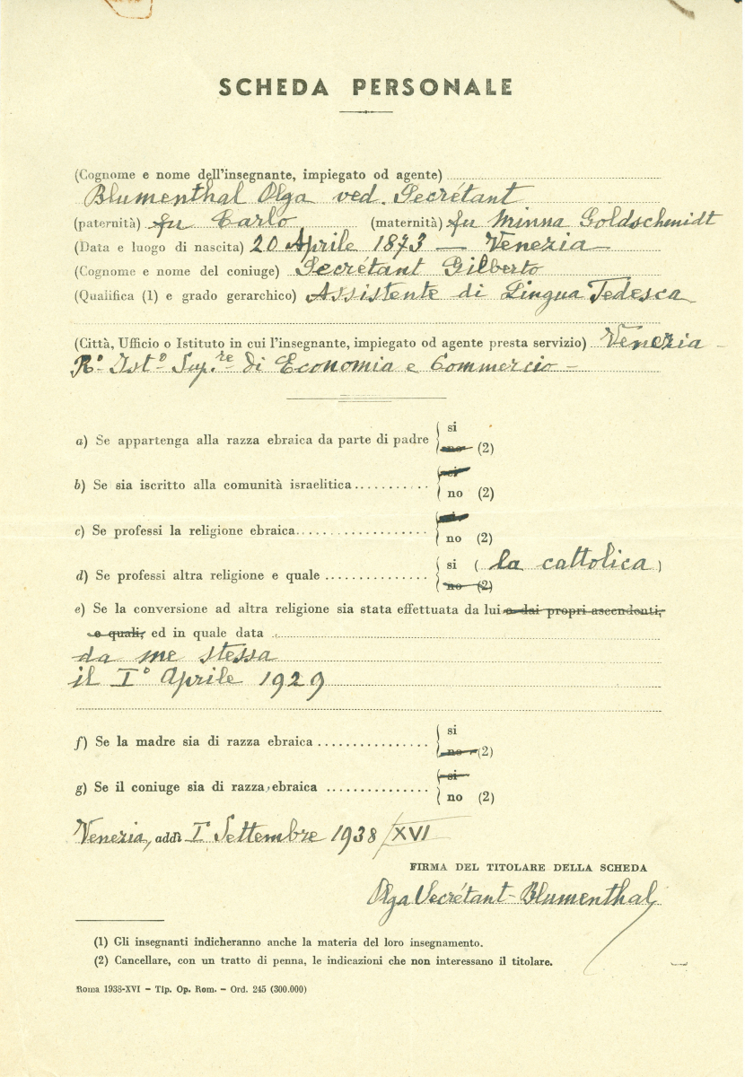 Ad agosto 1938 viene eseguita un’indagine in tutte le istituzioni scolastiche al fine di individuare il personale di “razza ebraica”. Nella sua scheda, Olga dichiara che entrambi i genitori erano ebrei, ma non lo era il coniuge. Sebbene l’ordine fosse quello di rispedire a Roma tutti i questionari compilati, quello di Olga Blumenthal rimane a Ca’ Foscari. Il nome di Olga non figurò nemmeno nella lista dei professori ebrei presenti a Ca’ Foscari. La mancata segnalazione di Olga rappresenta forse un’estrema forma di protezione verso l’anziana docente da parte dei colleghi che solo l’anno precedente si erano prodigati affinché potesse continuare a insegnare.
